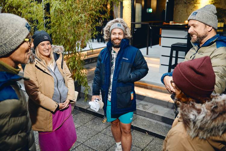 Die Organisatoren von Munich Hot Springs Irina Hey und Franz Mayr leiteten die Teilnehmer an und gaben eine ausführliche Anleitung für das Eisbaden und worauf man dabei achten sollte. Nach einer gemeinsamen Atemübung ging es schon direkt ins Wasser. Bei Wassertemperaturen von dreizehn Grad und einem regnerischen Wetter, war es jedoch für die Teilnehmer und Organisatoren ein aufregendes Erlebnis. Gleich nach dem Eisbad kamen die von Columbia gesponserten Winterjacken mit der neuen Omni-Heat™ Infinity Technologie direkt zum Einsatz und wärmten die zitternde Outdoor-Community schnell auf. Nachdem alle zurück in der Event-Location waren, kam die typische fröhliche “post ice bath” Stimmung auf und es wurde fleißig genetzwerkt.