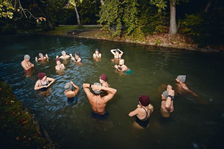 Nach der Vorstellung ging es schon direkt zum Eisbaden über. Die Event Räumlichkeiten waren sehr passend gewählt, da diese sich direkt am Eisbach im Englischen Garten befinden. So konnten die Teilnehmer unweit der Location eisbaden, da der Eisbach/Schwabinger Bach nur wenige Schritte von P1 entfernt ist.